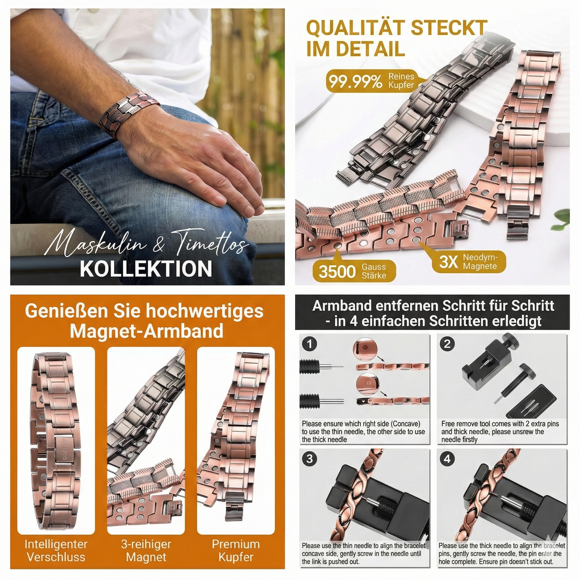 Es ist ein Armband aus reinem Kupfer mit integrierten Magneten, das für den täglichen Gebrauch entwickelt wurde und oft zur Unterstützung von Wohlbefinden, Schmerzlinderung und Durchblutung getragen wird.
