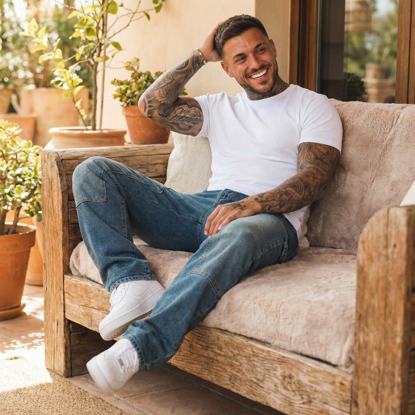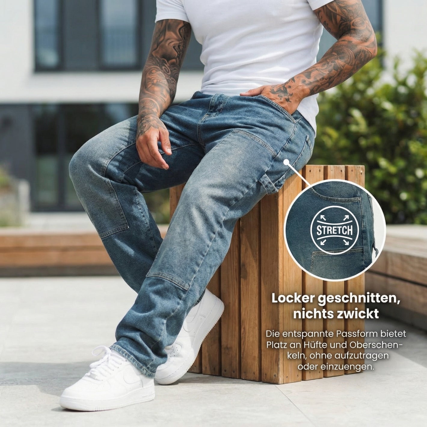 Ja. Der Relaxed Fit ist bewusst locker geschnitten und bietet ausreichend Bewegungsfreiheit an Hüfte und Oberschenkeln, ohne einzuengen.