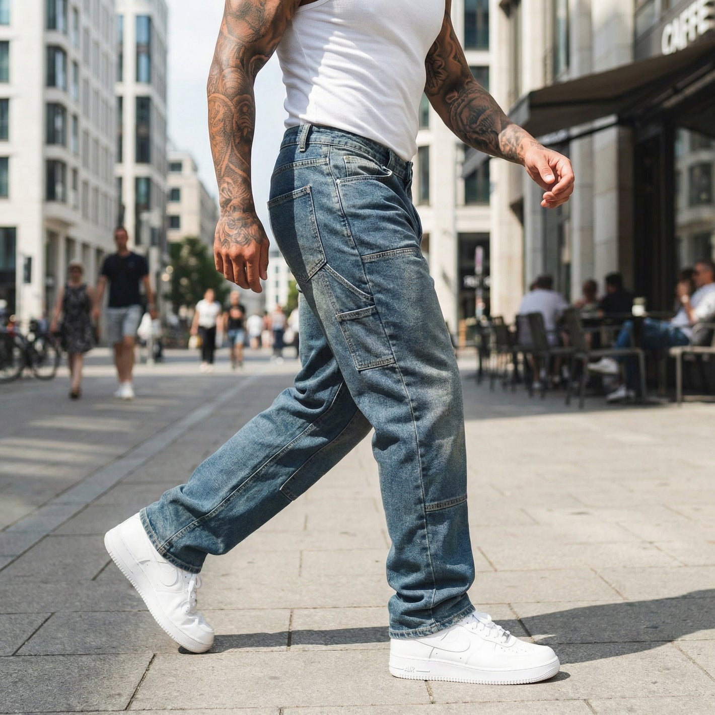 - Glätten Sie den Stoff, damit die Jeans sauber fällt und den Relaxed-Fit-Look perfekt zeigt.