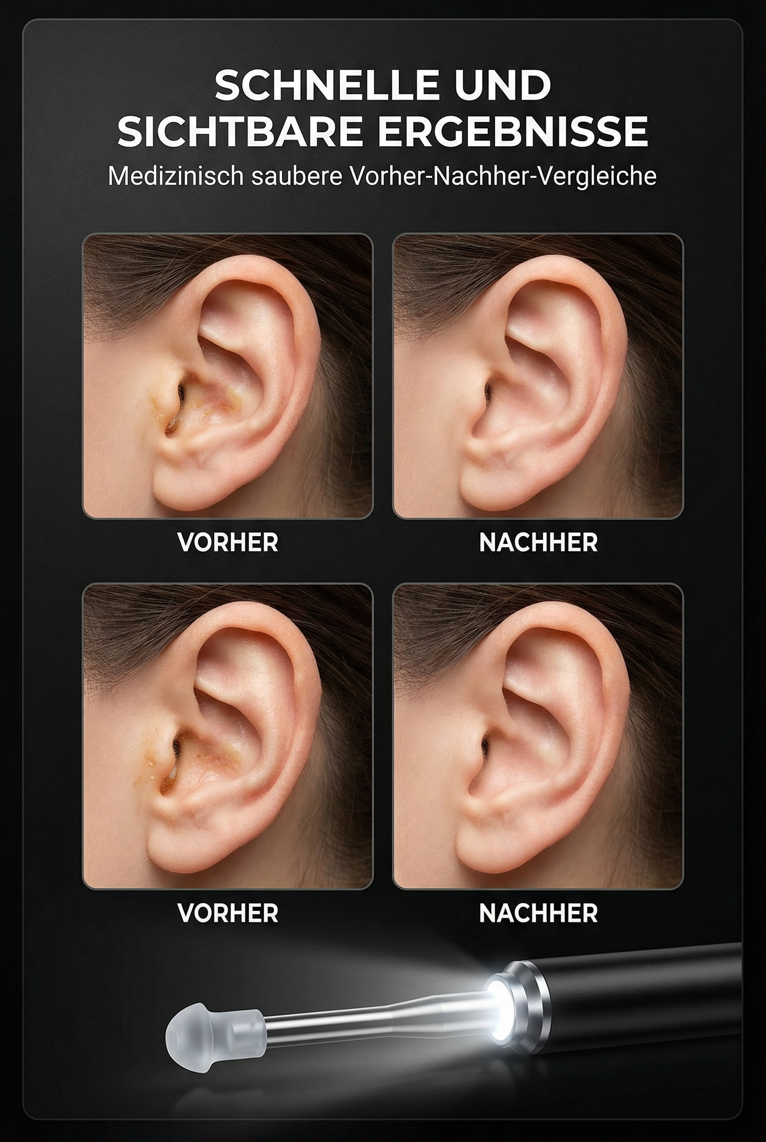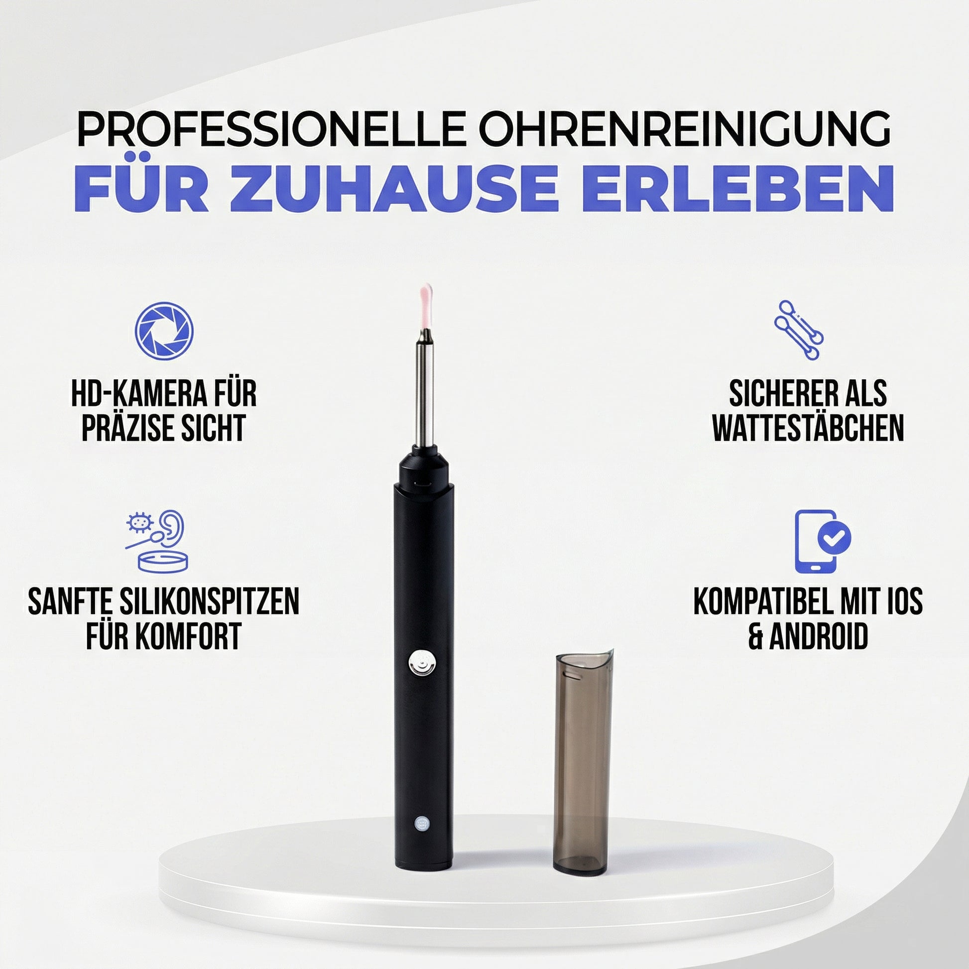 Die HD-Kamera gibt Ihnen klare Sicht, während weiche Silikonspitzen präzise helfen, ohne Druck und ohne blindes Schieben. Ideal für alle, die zu Hause eine sichere Lösung suchen und das beruhigende Gefühl wollen, alles im Blick zu haben.