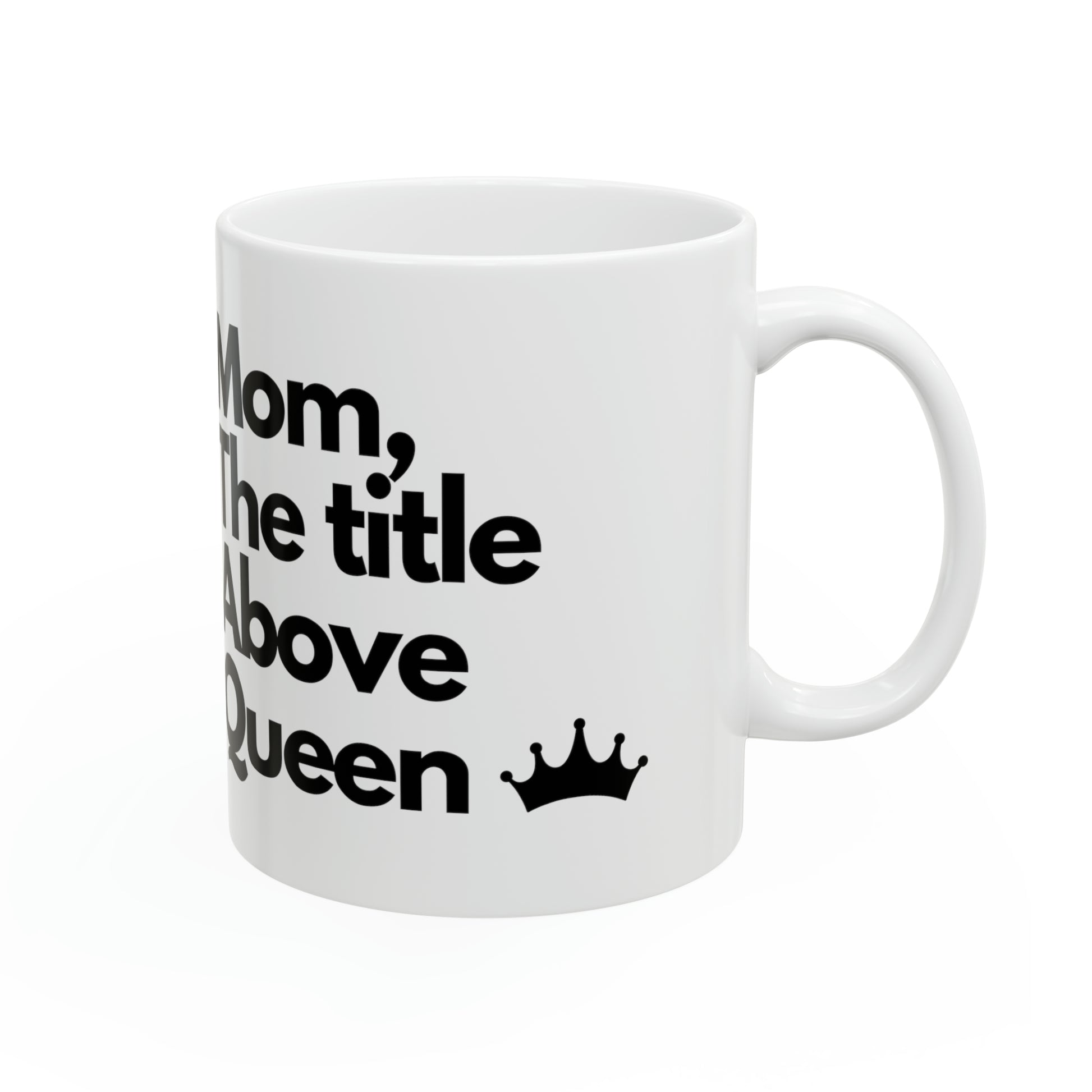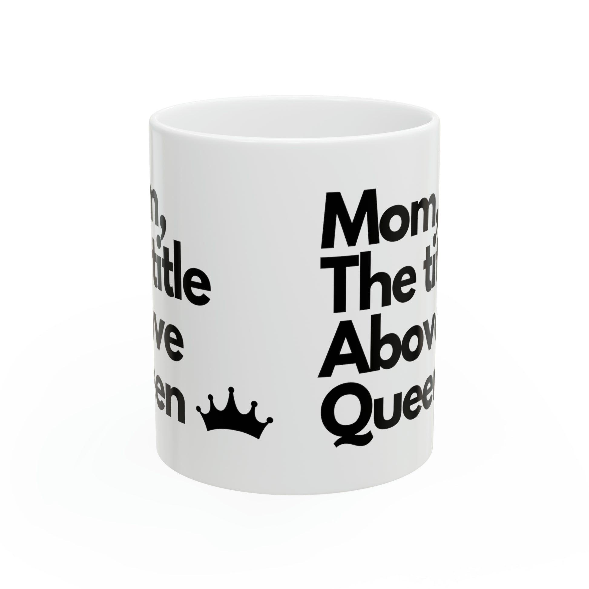 The captivating design places the words "Mom, The Title Above Queen" front and center, creating a visually striking and emotionally resonant piece. Crafted with care, the ceramic mug boasts a comfortable handle and a generous capacity, making it the perfect companion for sipping your favorite beverages.