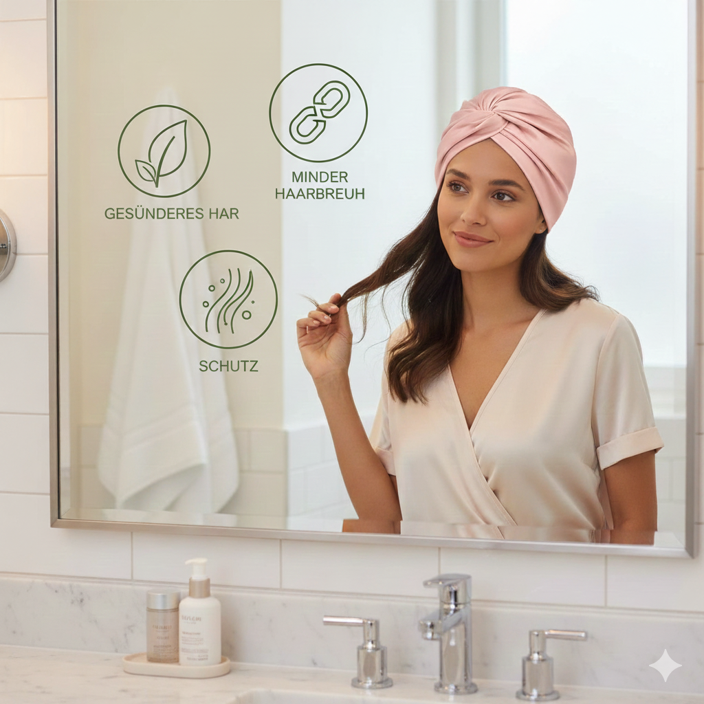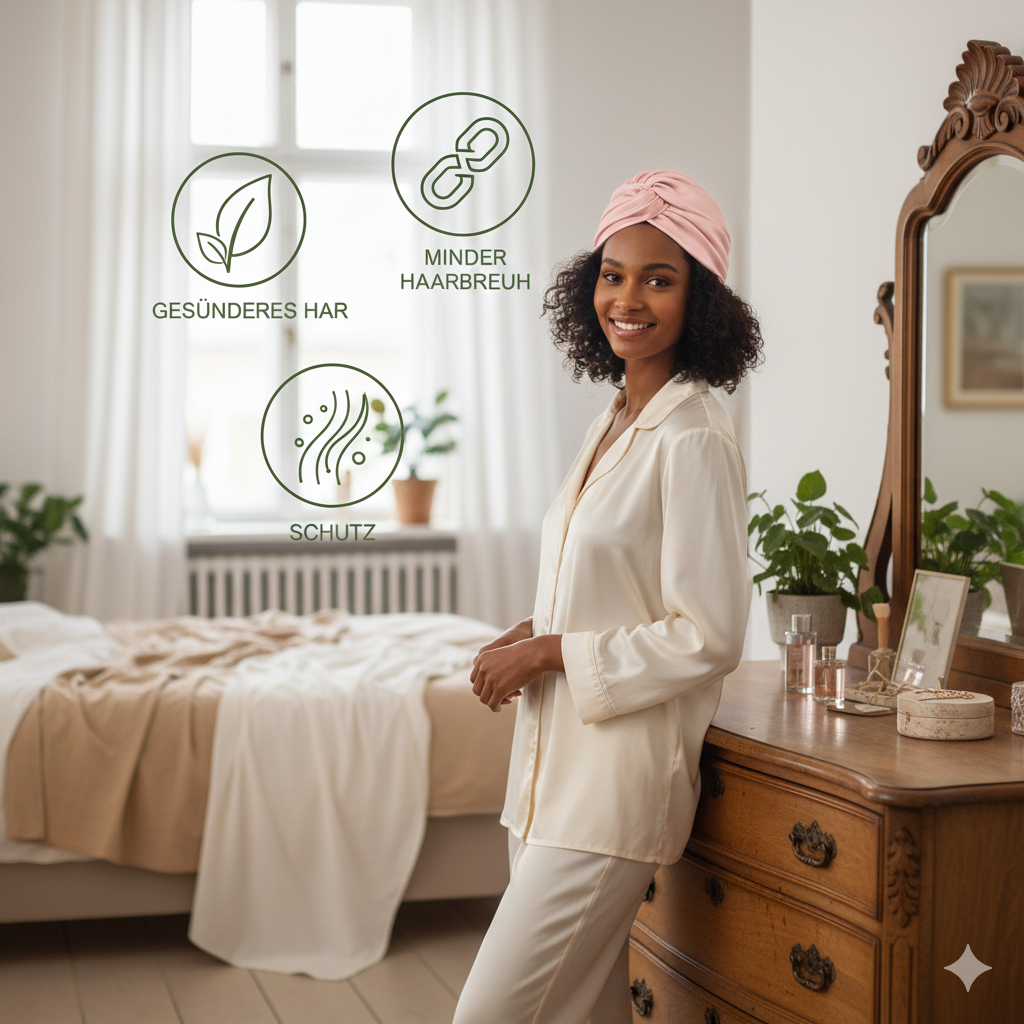 Verwöhnen Sie Ihr Haar während des Schlafs mit ultimativer Pflege. Die Premium Seidenmütze wurde entwickelt, um Reibung zu reduzieren, Feuchtigkeit zu speichern und Ihr Haar vor Verfilzungen, Haarbruch und Frizz zu schützen.