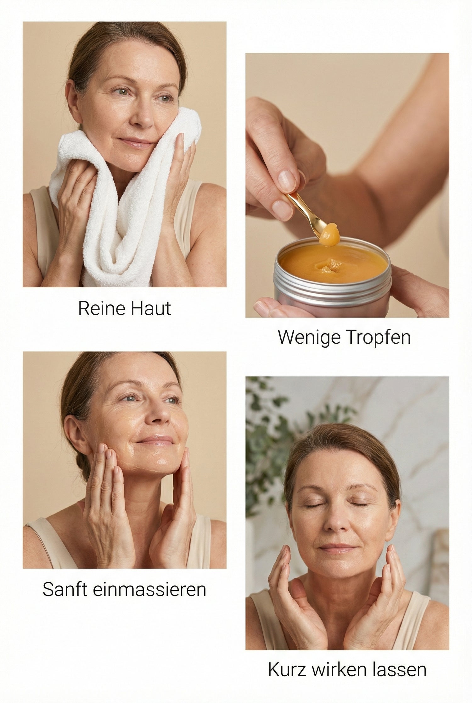 Viele Anwenderinnen berichten von einem ruhigeren Hautgefühl bereits nach kurzer Zeit. Für sichtbare Verbesserungen empfehlen wir eine regelmäßige Anwendung über mehrere Wochen.