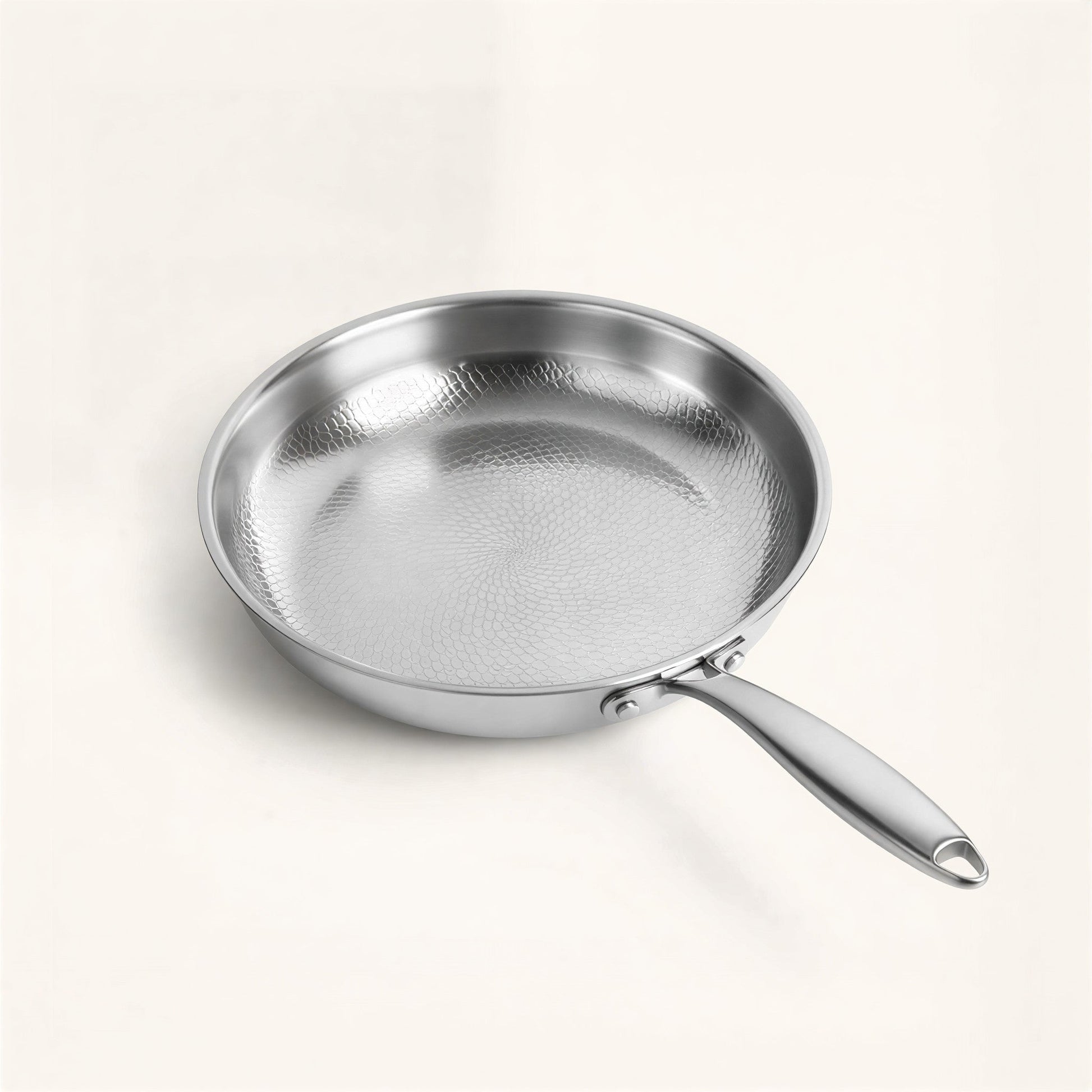 Entdecken Sie die ultimative Kochinnovation mit der Titanium Gehamerde Pan Pro, jetzt mit einem einzigartigen gehämmerten Muster. Dieses Design ist nicht nur für das Auge gedacht. Die gehämmerte Oberfläche schafft Mikro-Räume, die den direkten Kontakt mit Lebensmitteln reduzieren, wodurch ein Anbrennen verhindert wird und das Öl besser verteilt wird, um ein gleichmäßiges Garen zu gewährleisten.