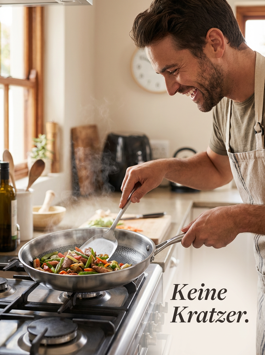 Du kannst problemlos Metallspatel, Schneebesen, Gabeln und Messer verwenden. Titan ist extrem kratzhart und kommt ganz ohne empfindliche Beschichtung aus. Rühren, schaben und schneiden diese Pfanne hält es aus.